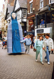 This first giant was taken for a walk through the streets of Chester at midsummer 1989. A second giant was made at Lache Junior School, a unicorn at Lache Adventure Playground and a Dragon at NACRO New Careers Training in 1990. The parade at midsummer that year was the first for over 300 years.